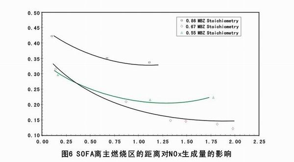 NOx的生成量与SOFA离主燃烧区的距离成反比关系,见图6。但SOFA离主燃烧区的距离过大,将对锅炉飞灰含碳量造成一定影响。