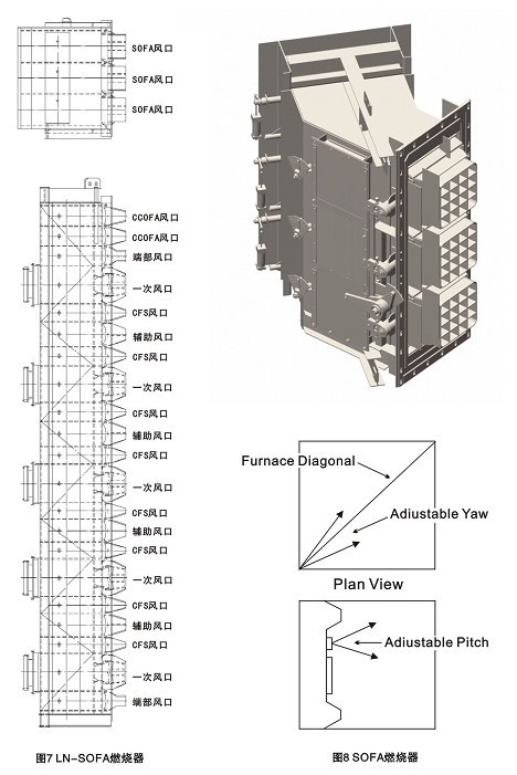 · 可水平摆动的分离燃尽风(SOFA),见图8,布置于主燃烧器上方3-6米区域
