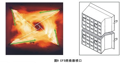 · 预置水平偏角的辅助风喷嘴(CFS),见图9,布置于主燃烧器煤粉喷嘴之间
