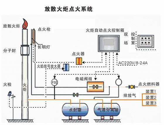 放散火炬系统配置主要包括火炬头、长明灯、火焰检测装置、点火装置、放散筒体、气液分离罐、水封罐、泵、点火及程序控制柜等;根据不同的用途可配置相应的伴烧及消烟设备;安装不同的基座可实现陆用高架火炬、海上转臂火炬及海上平台火炬等方式;此外,可根据用户的要求配置输气管路上的阀门、仪表、管道阻火器等设备。在以上基础上配置相应的火炬放散控制系统,可方便地实现远程自动点火及熄火保护等功能,点火方式有高空点火、地面爆燃传焰式点火等。