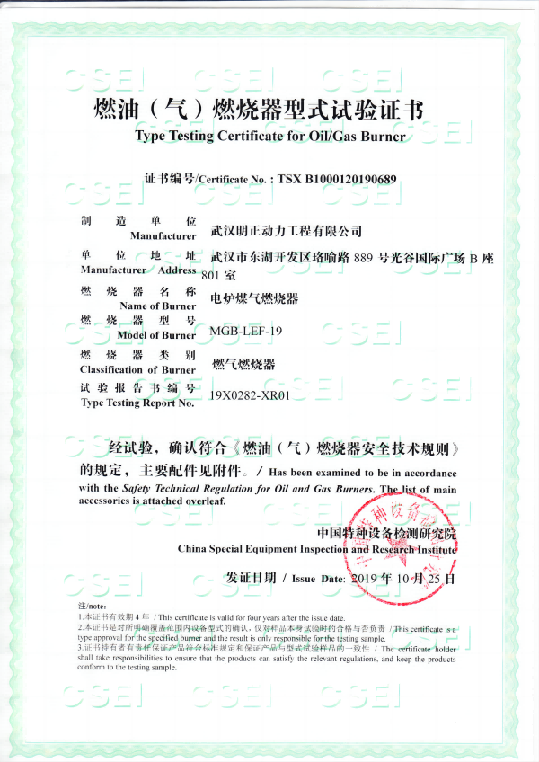 燃烧器型式试验证书
