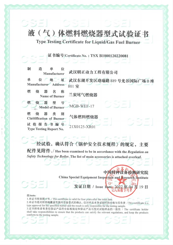 燃烧器型式试验证书