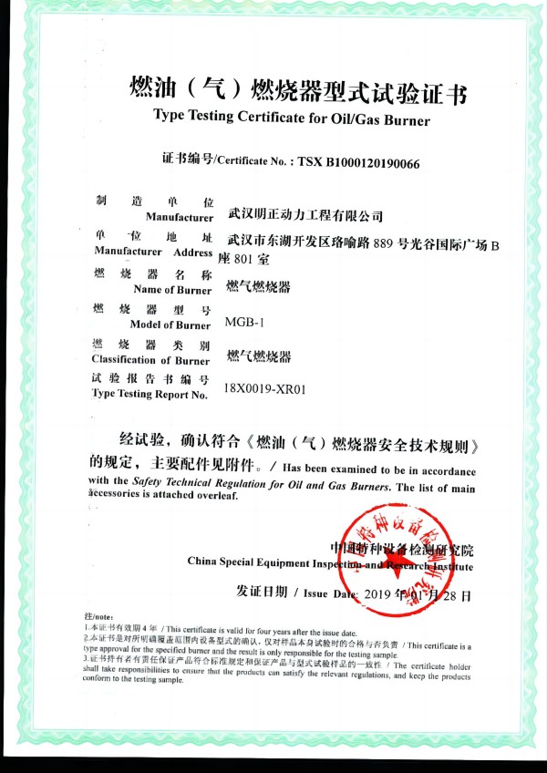 燃烧器型式试验证书